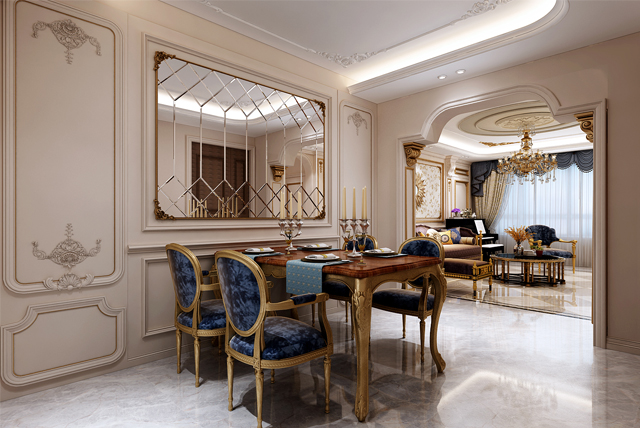 餐桌和餐椅均為金色色,表面略帶雕花,配合扶手和椅腿的弧形曲度,顯得優雅矜貴,而在深藍色的卷草紋窗簾、水晶吊燈的搭配下,浪漫清新之感撲面而來。