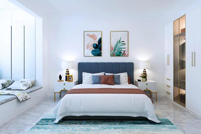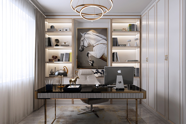 客廳白黑為主色調(diào),灰色系沙發(fā)低調(diào)淡雅,與背景墻上的裝飾畫(huà)相呼應(yīng),彩色的靠背進(jìn)行點(diǎn)綴,在中央擺放地毯,提升整體空間的溫度,也打造出整體客廳的層次感,書(shū)房整體呈現(xiàn)寧?kù)o的氛圍,利用黑色和各種中性色調(diào),演繹空間的氣質(zhì)。臥室風(fēng)格簡(jiǎn)約,藍(lán)色軟裝床頭及燈具的點(diǎn)綴,為臥室增添頗具質(zhì)感的格調(diào)。
